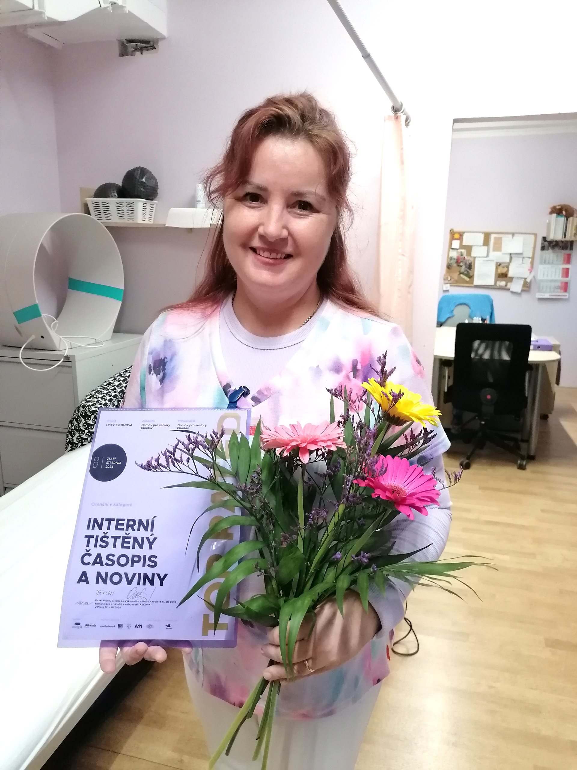 Ředitelka DS Chodov Ilona Veselá spolu s Kateřinou Svobodovou předaly kopie ocenění spolu s květinami a poděkováním autorkám, které se na tvorbě časopisu pravidelně podílejí. Klientkám Domova, paní Ireně Prchalové a Magdaleně Zikové a pracovnici Domova Editě Svobodové.