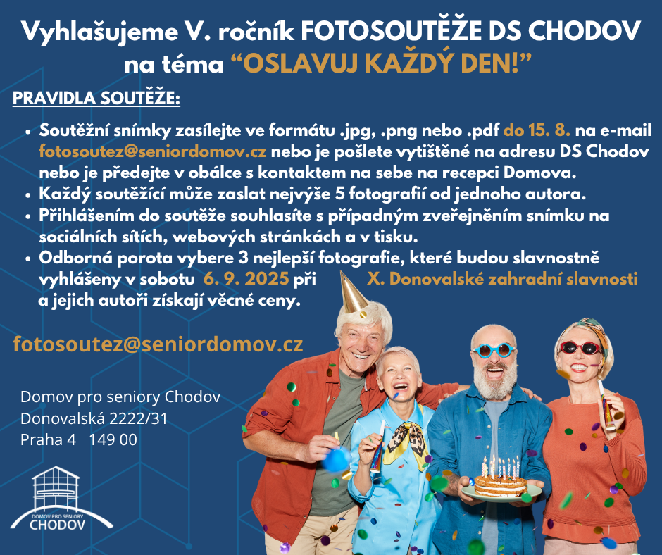 - Soutěžní snímky zasílejte ve formátu .jpg, .png nebo .pdf do 15. 8. na e-mail fotosoutez@seniordomov.cz nebo je pošlete vytištěné na adresu DS Chodov nebo je předejte v obálce s kontaktem na sebe na recepci Domova.