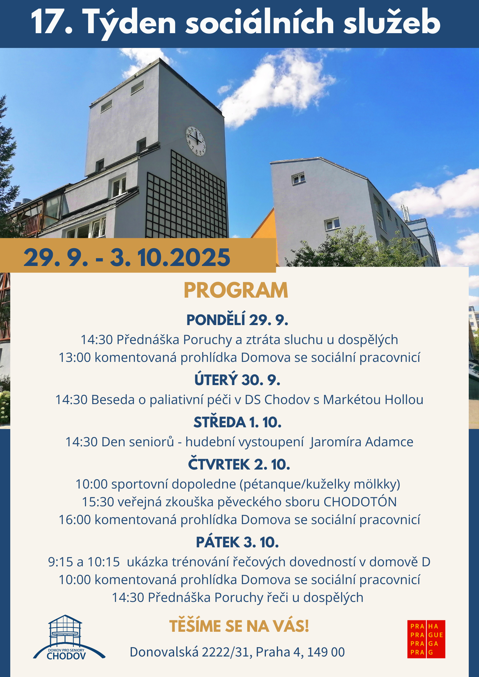 17. Týdne sociálních služeb a koncipovali s přihlédnutím ke specifiku DS Chodov, jímž je poskytování služby pro seniory neslyšící a pro seniory po cévních mozkových příhodách a jiných onemocněních mozku.