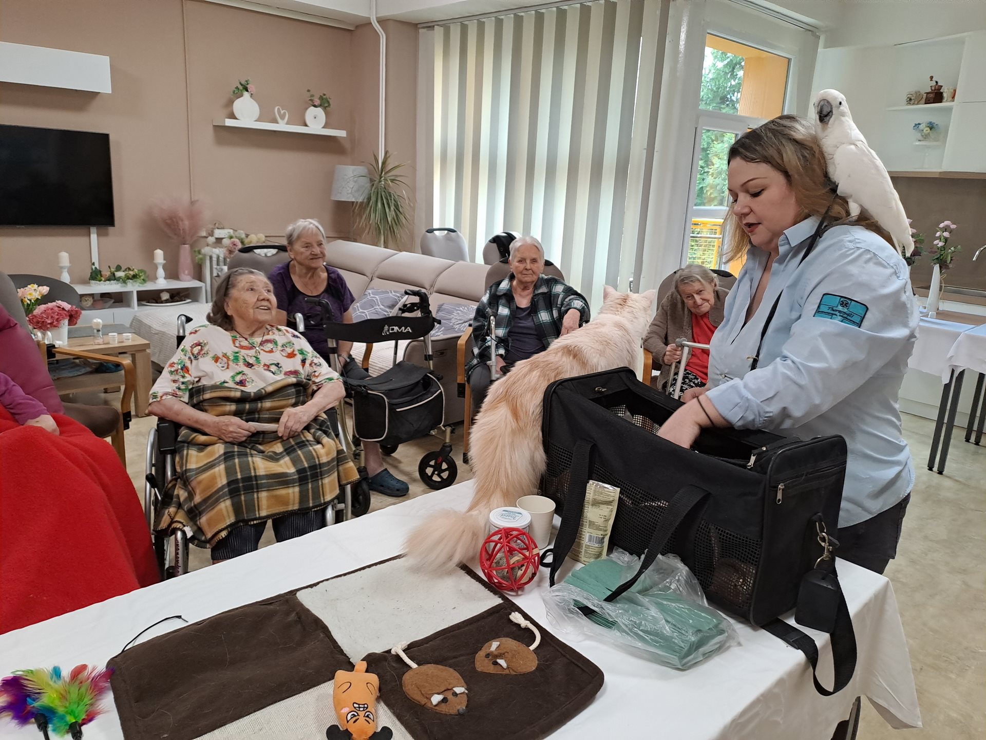 Obyvatele domova A velice potěšila animoterapie, při které je navštívila chovatelka s mainskou mývalí kočkou, kotětem a papouškem. Vyprávění zajímavostí ze života těchto zvířat bylo velmi poutavé a možnost zvířata pohladit byla pro klienty úžasným zážitkem. Po skončení skupinového setkání paní chovatelka navštívila na pokoji paní Dagmar, které se věnovala individuálně.