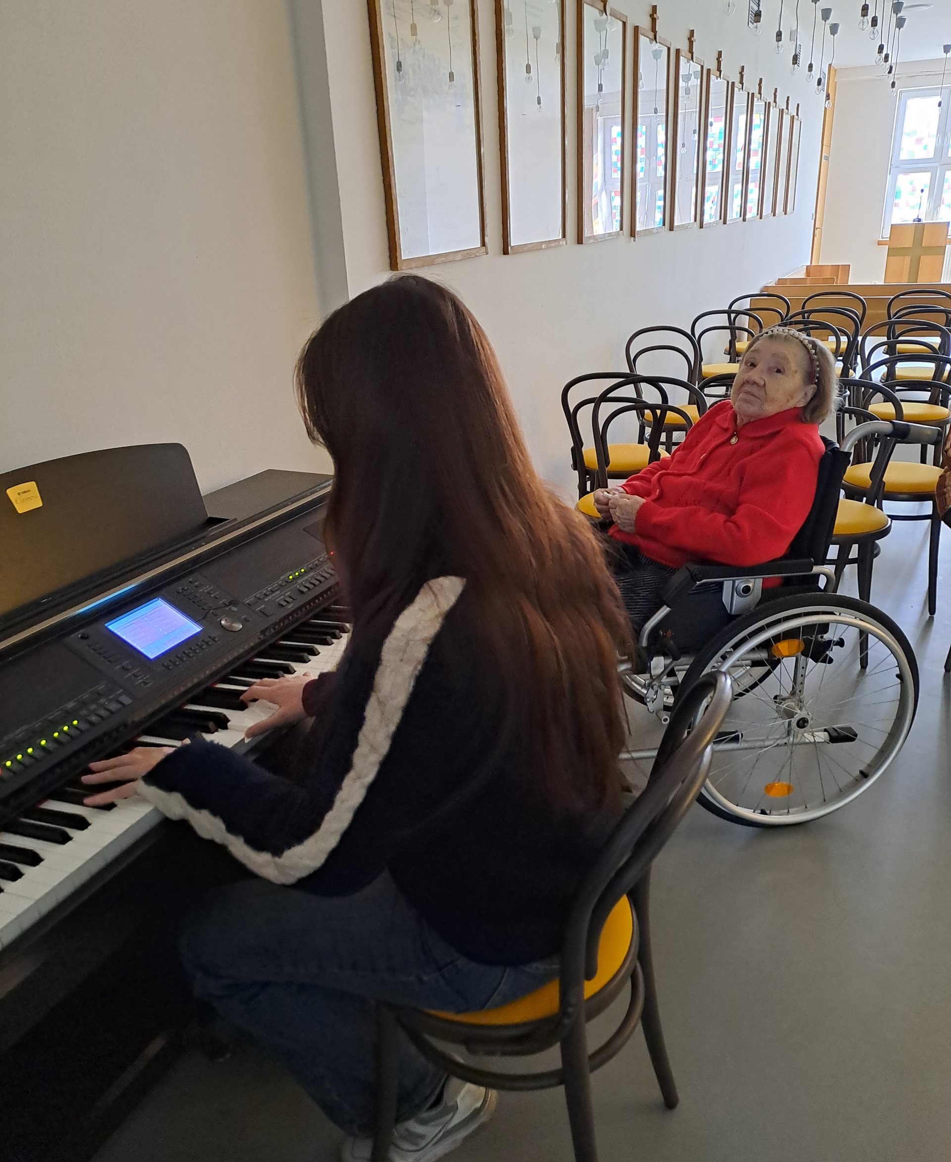 Paní Jiřina využila možnosti poslechnout si hru na klavír v podání studentky z Francie, která byla v DS Chodov na stáži. Komorní vystoupení pouze pro ni se konalo v kapli Domova.