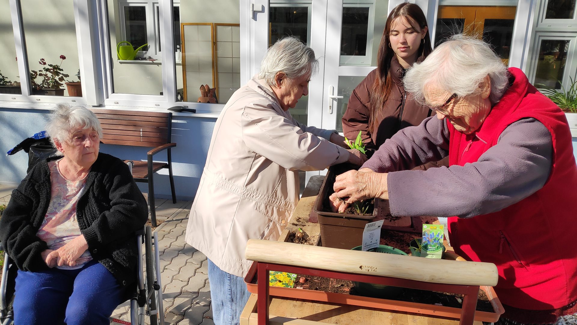 Když počasí přálo a sluníčko již začalo hřát, nejen paní Libuše, ale i ostatní obyvatelé domova A s chutí sázeli květiny do truhlíků na zahradě. Pro paní Jarmilu to byl opravdu příjemný zážitek, protože se zahradničení ráda věnovala celý život.