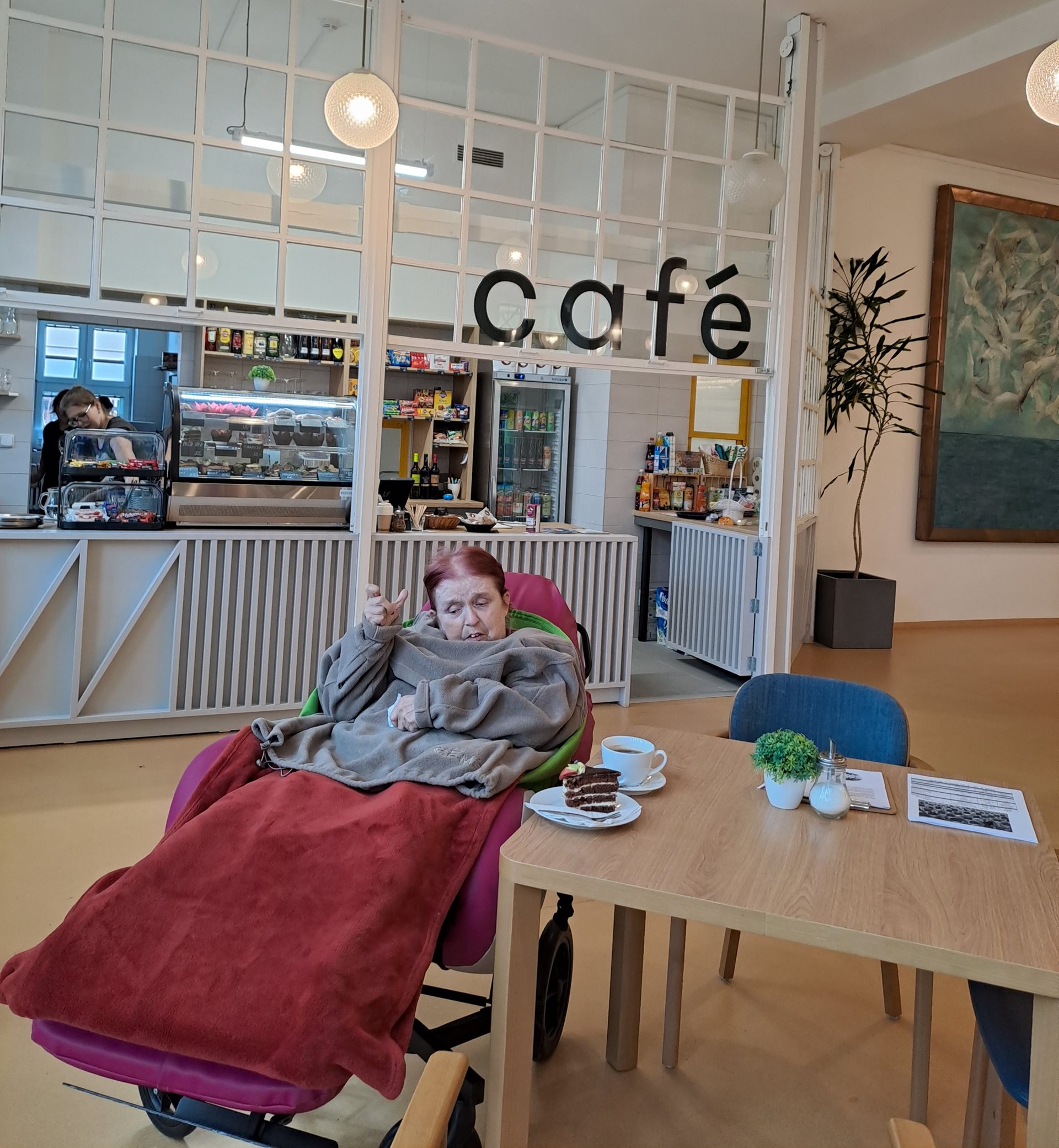 Aktivizační pracovnice Tereza doprovodila paní Jarmilu na návštěvu nově otevřené kavárny Bílá vrána v hale Domova, aby mohla ochutnat místní zákusky a zhodnotit nabídku.