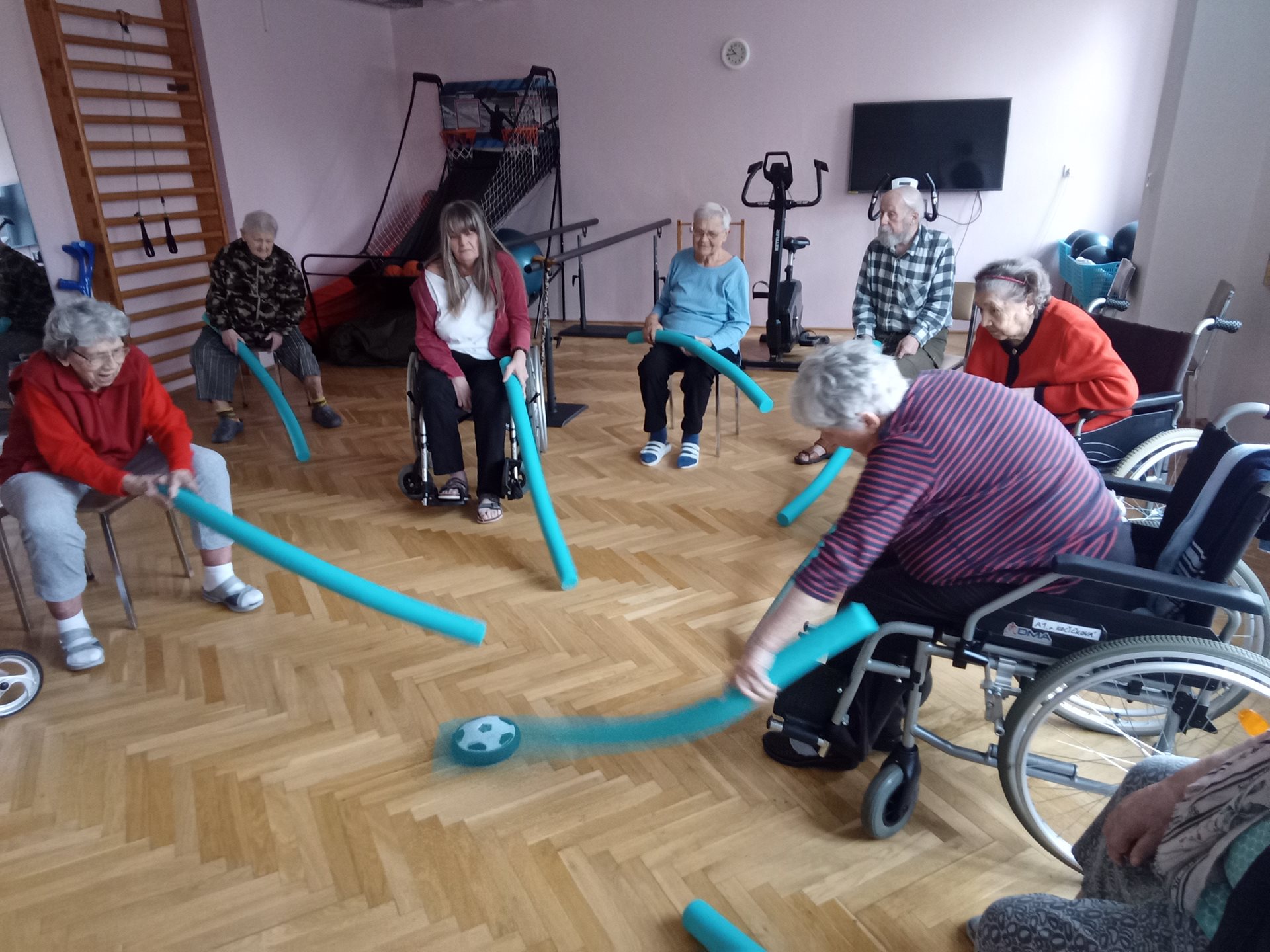 S aktivizační pracovnicí Barborou si klienti užili netradiční kondiční cvičení, při kterém si zahráli "hokej" s využitím pěnových žížal a interaktivního míče.