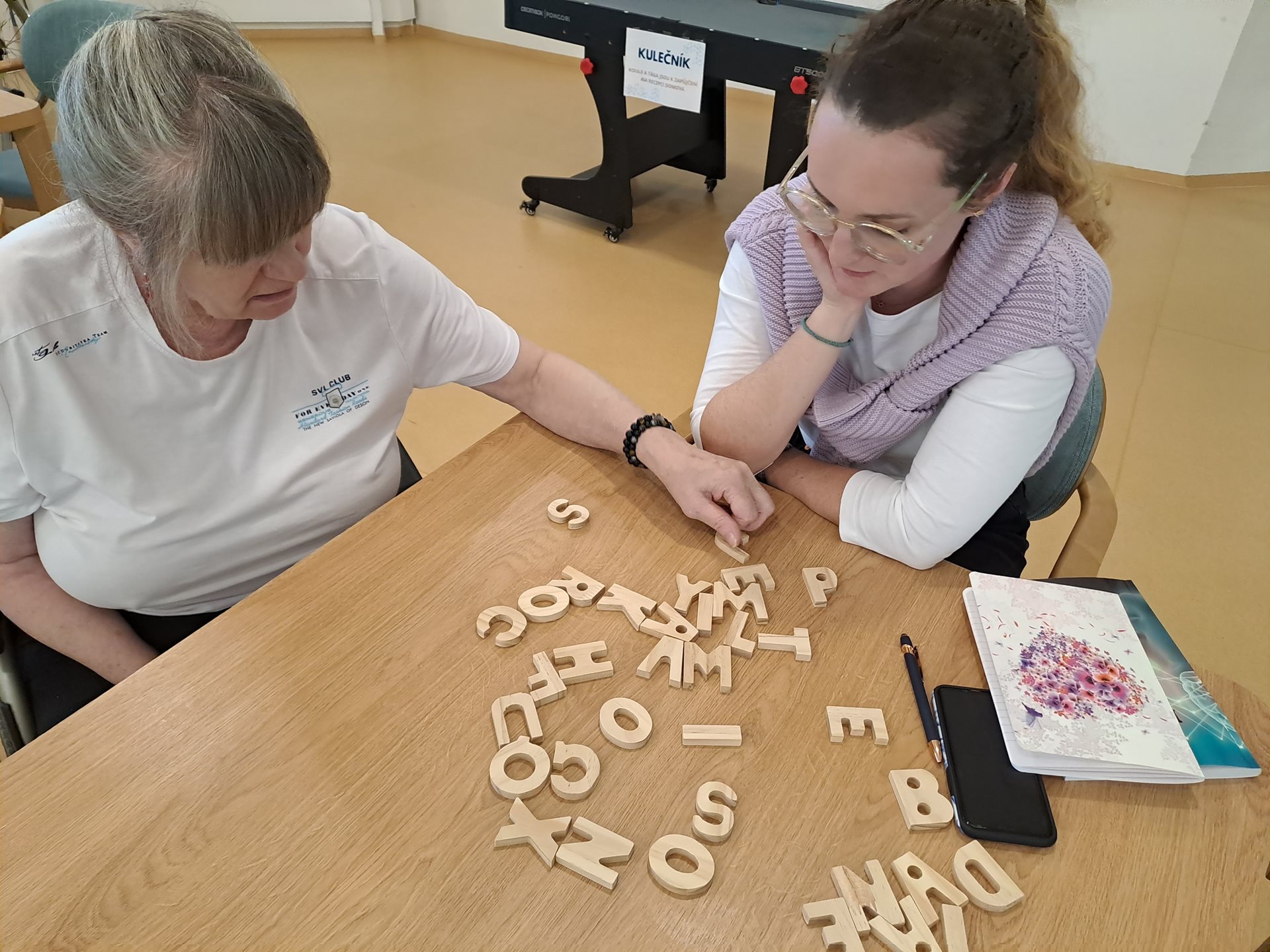 Paní Libuše individuálně trénuje řečové dovednosti s logopedkou Kateřinou a velice ji baví zajímavé pomůcky, které při tréninku využívají.