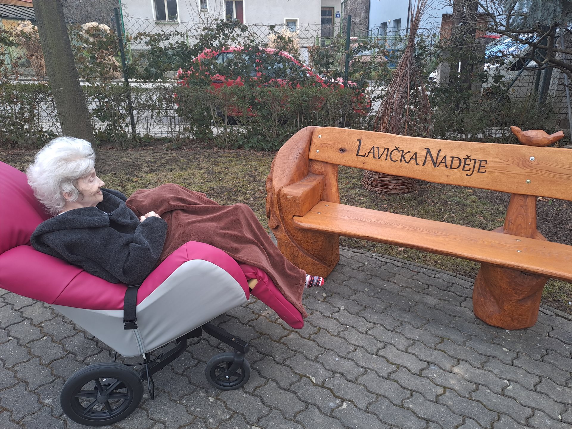 Paní Jitka při procházce v doprovodu aktivizanční pracovnice Terezy navštívila Lavičku naděje na velké zahradě a pohladila holubici, která zdobí její opěradlo a podle autorky lavičky plní přání těm, kdo na ni položí dlaň.