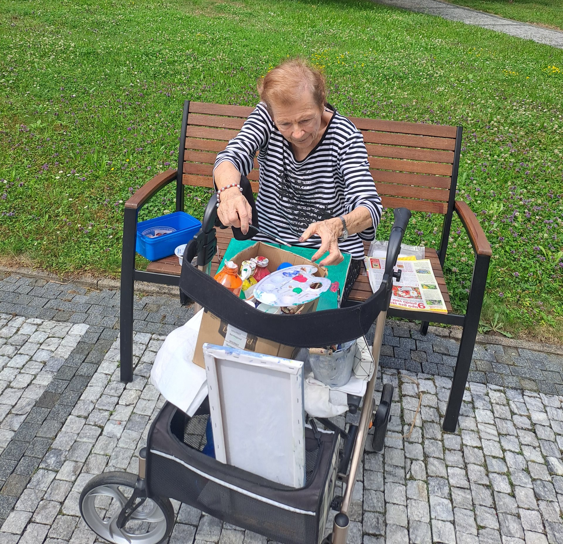 Paní Zlata se tentokrát svému koníčku – malování věnovala v letně rozkvetlé zahradě.