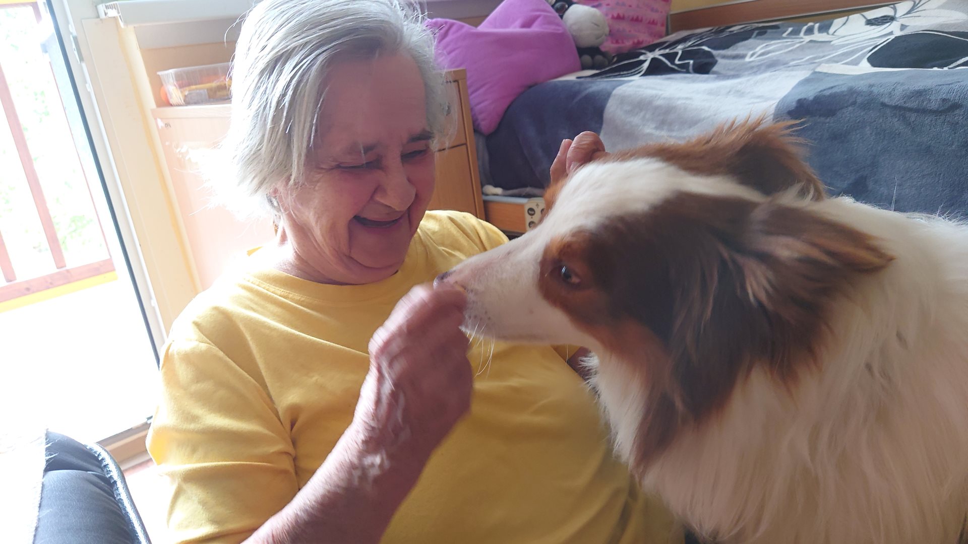 Paní Věra a Drahomíra si užívaly psí společnosti. Návštěva jim udělala velkou radost a vykouzlila krásné úsměvy na tvářích.