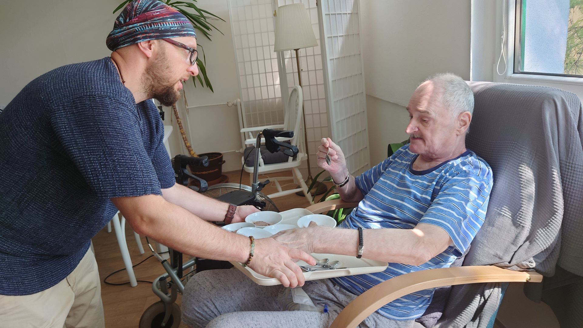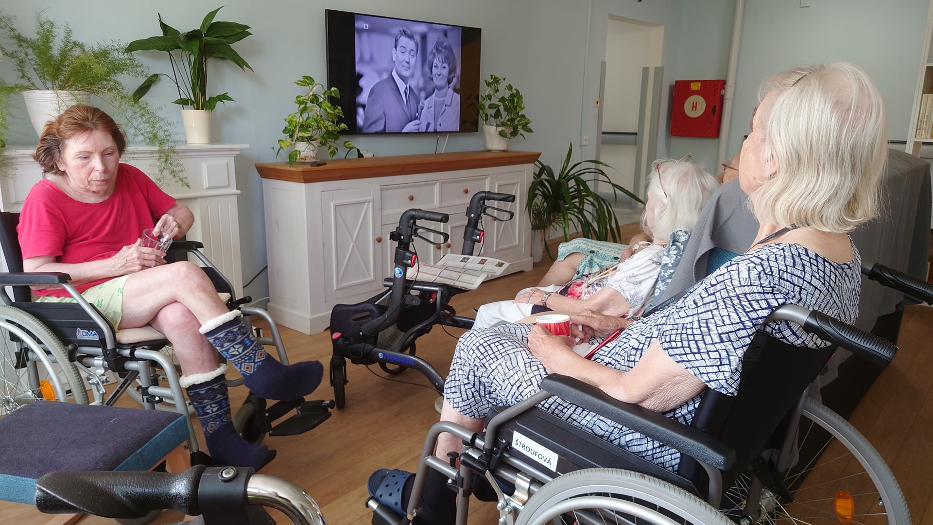 Paní Marie, Eva, Věra, Václava, Drahomíra a p. František se sešli ve společenské místnosti u společného poslechu hudebních záznamů ze 60 let. S ohledem na horké letní počasí si pochutnali na zmrzlině.