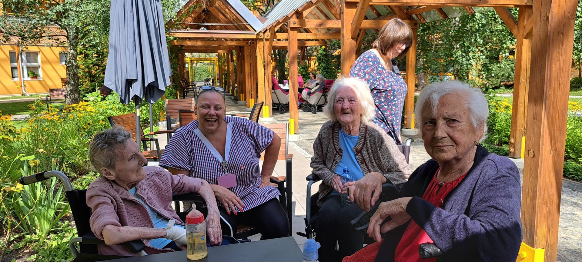 P. Hana, Jiřina. Miluše, Olga, Alena, Miluše, Marie, Vlasta, Marie, Anna, Alenka a Anička krásné letní dny tráví dle své chuti a přání s ostatními klientkami na zahradě Domova. Občas jen tak posedí, popovídájí, někdy si zahrají Člověče nezlob se apod.