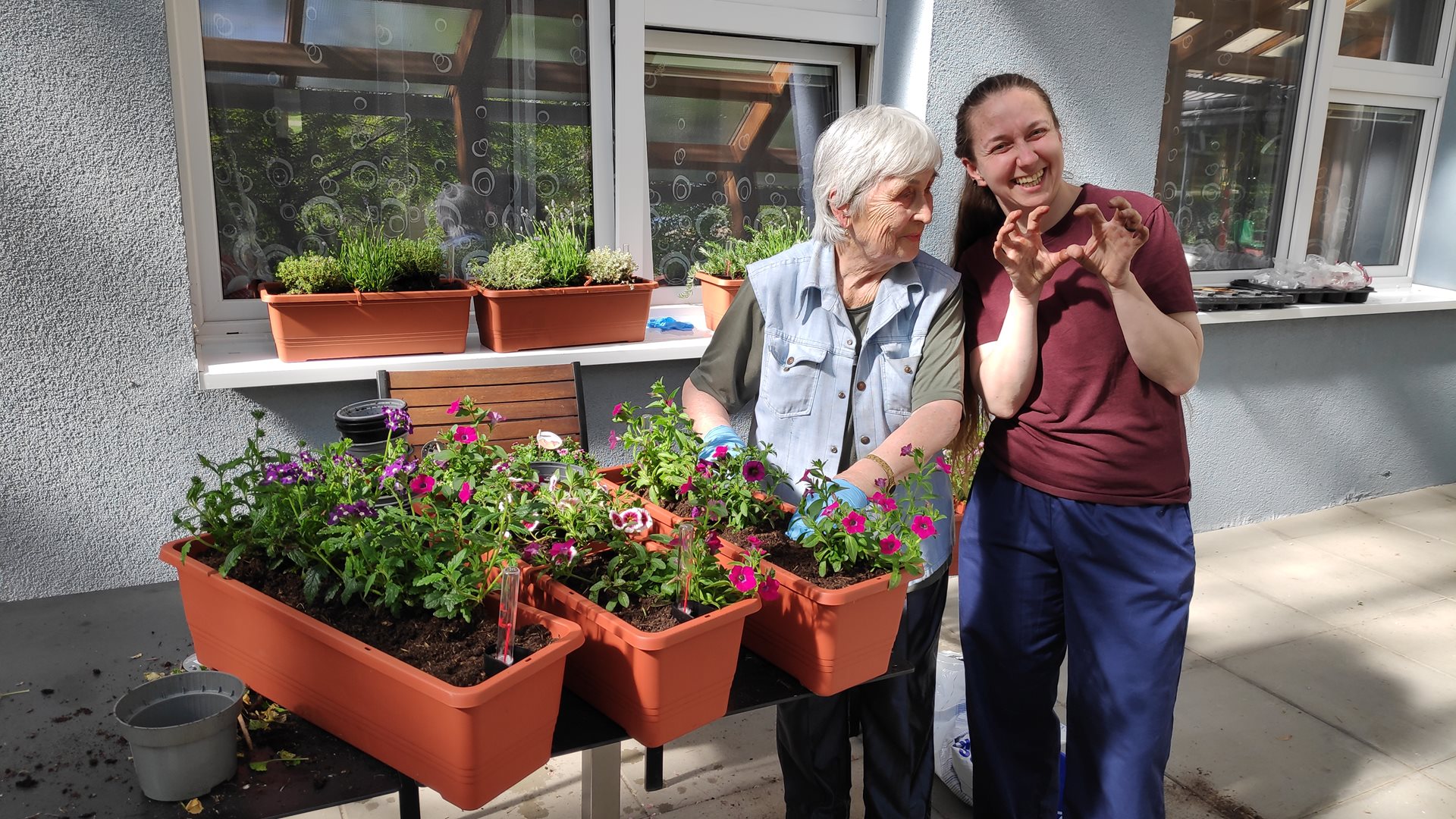 Paní Marie ve spolupráci s aktivizační pracovnicí Adélou osázela květinové truhlíky a užily si při tom spoustu legrace.