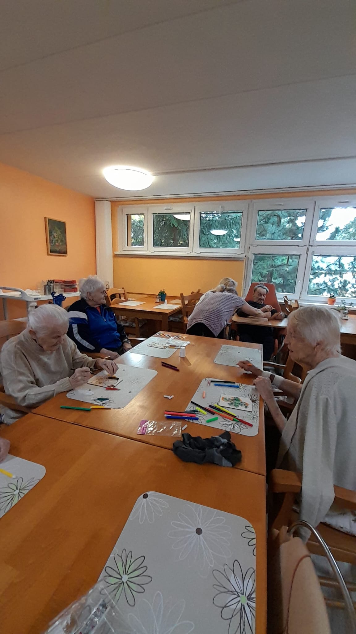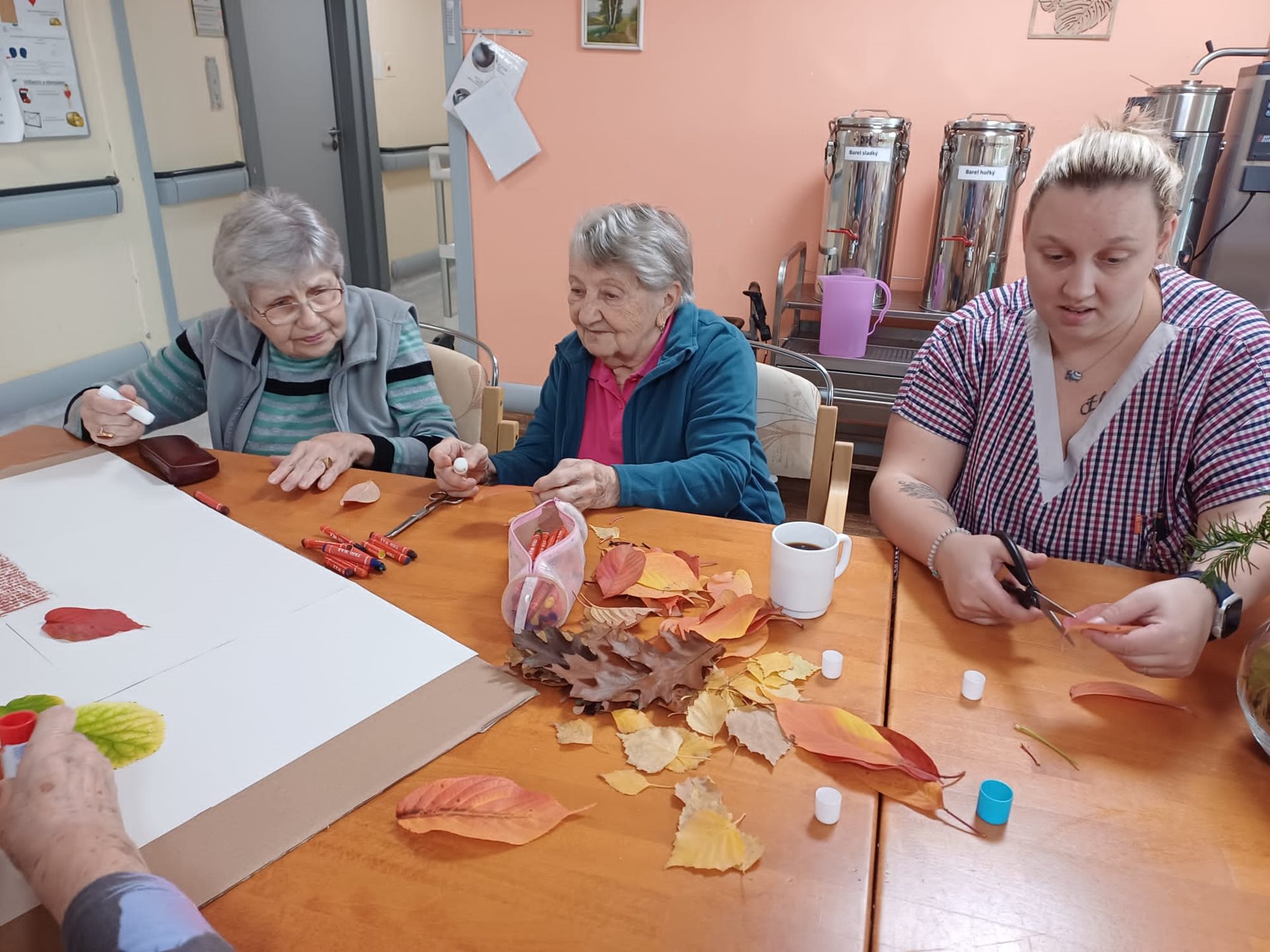 Podzim je v domově B plný tvořivosti. V sychravém počasí si obyvatelé domova s pečovatelkami rádi zpestří společný čas vytvářením krásných dekorací. Třeba paní Jana, Hana, Ludmila, Jiřina a dvě paní Ludmily s pečovatelkami vytvořily strom ozdobený suchými listy ze zahrady. Při dalším setkání paní Ludmila, Drahomíra, Alenka, Jana a pan Přemysl jejich výtvor doplnili barvami.