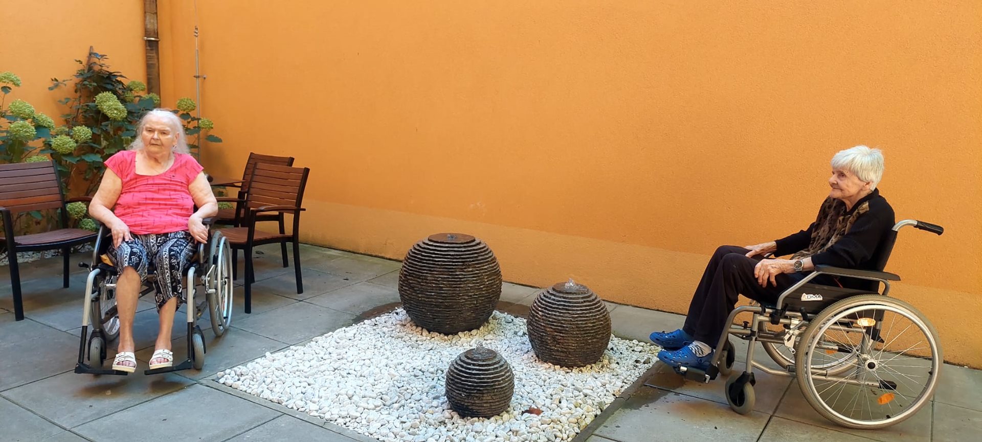 Paní Eva a Radmila relaxovaly v letních dnech u fontány v atriu Domova.