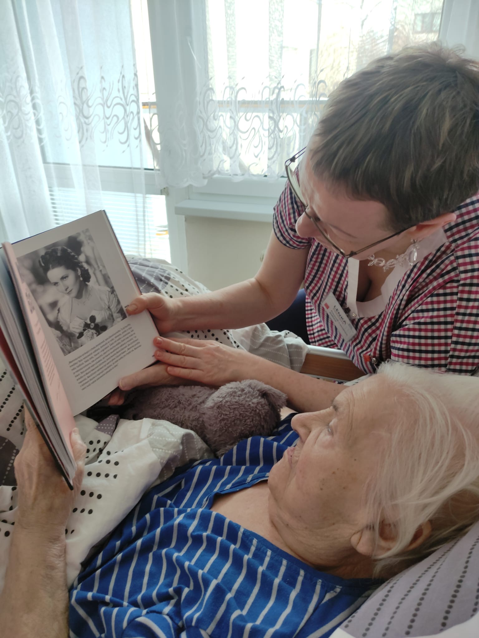 Pečovatelka Lenka si s klientkou paní Miluškou společně četla a povídala si o její oblíbené knize Hvězdné tváře českého filmu. Paní Miluška má tuto knihu velmi ráda, ráda si v ní čte a prohlíží přiložené fotografie známých herců. Tentokrát se s pečovatelkou zaměřily na osobnosti pana Jedličky a paní Fialové a společně zavzpomínaly na jejich známé filmové role. Setkání probíhalo v klidné a příjemné atmosféře a bylo pro klientku velmi potěšující.
