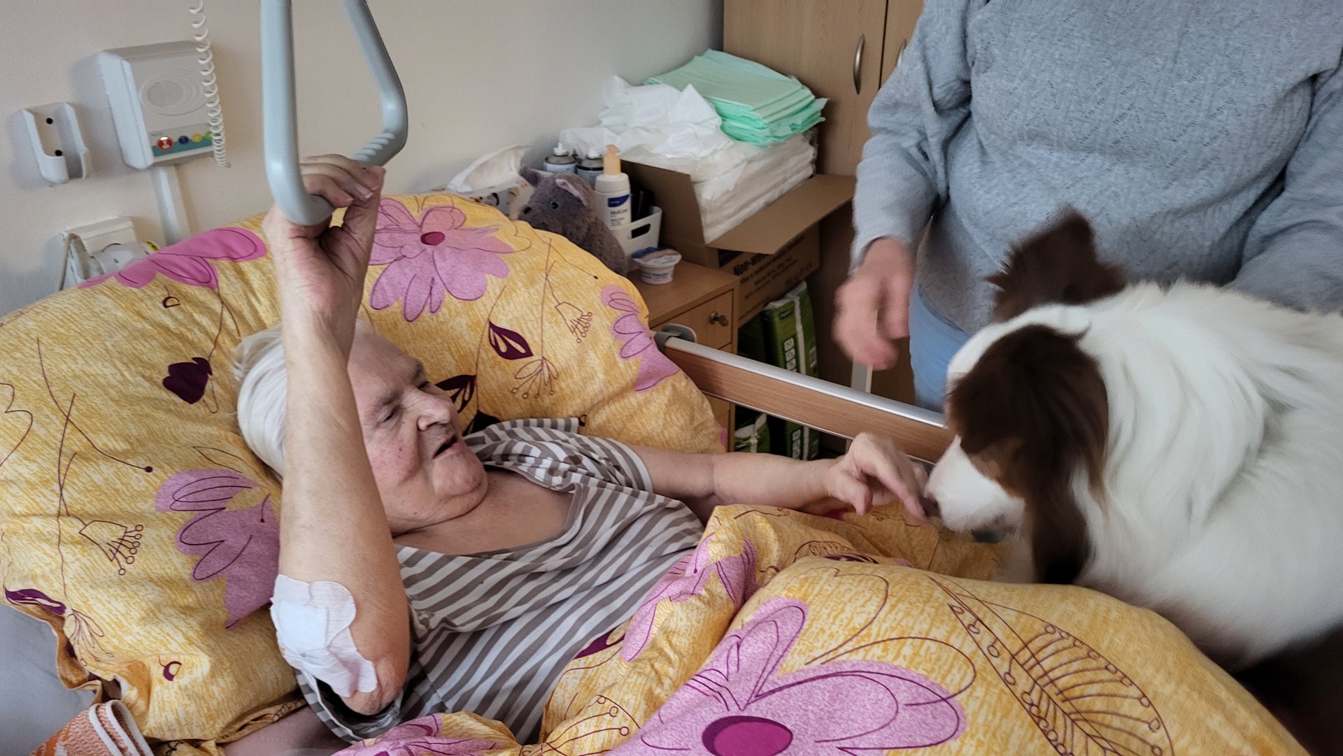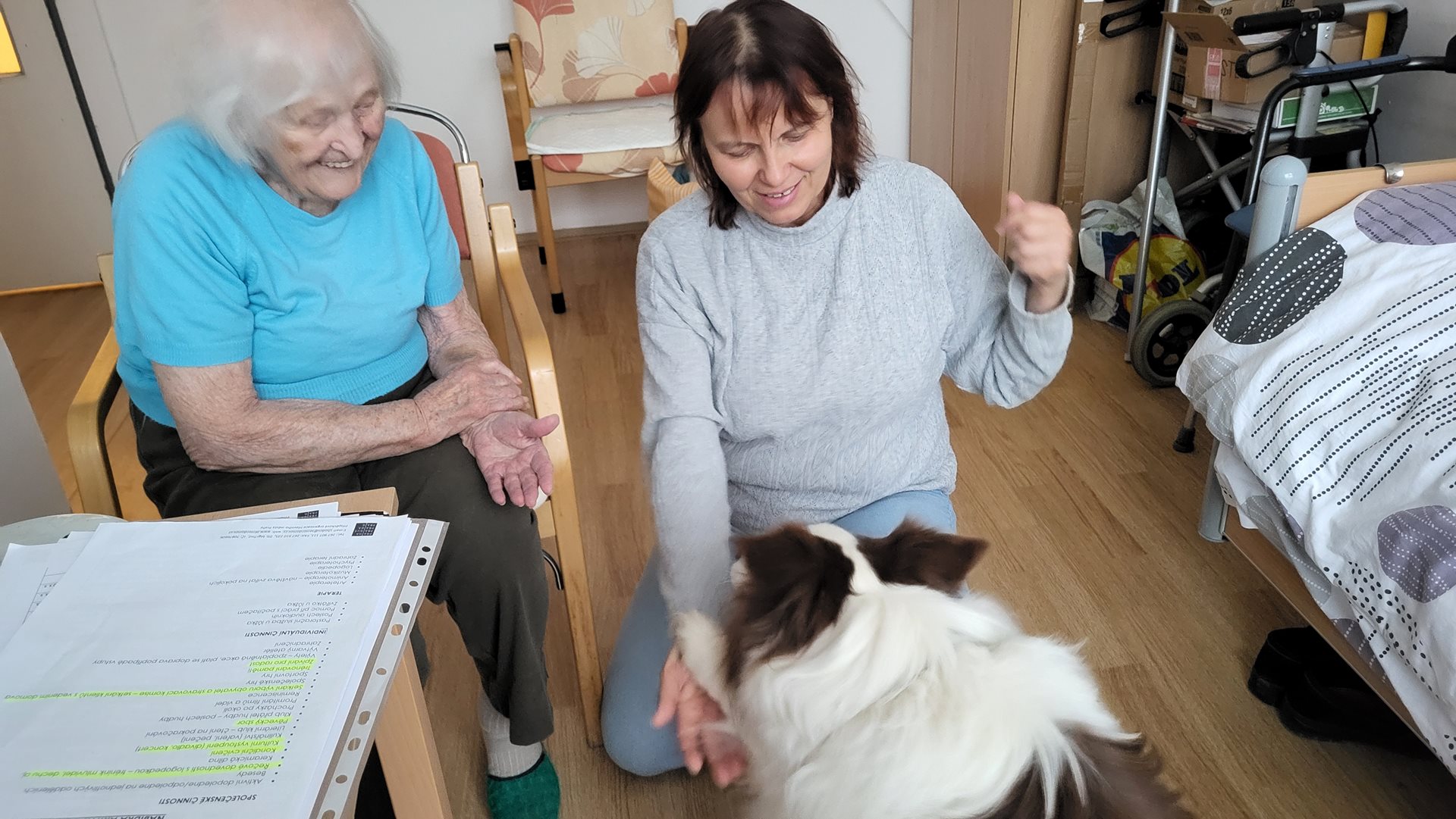 Klientky, paní Miluška a paní Vlasta, si naplno užily návštěvu canisterapeutického psa Lotýska, který do Domova pravidelně dochází potěšit klienty. Setkání s Lotýskem přineslo klientkám radost, úsměv i možnost blízkého kontaktu, který působí uklidňujícím a pozitivním způsobem. Opět se ukázal velmi příznivý vliv canisterapie u seniorů – přispívá k psychické pohodě, navozuje pocit bezpečí, snižuje napětí a podporuje aktivizaci vzpomínek i emocí.