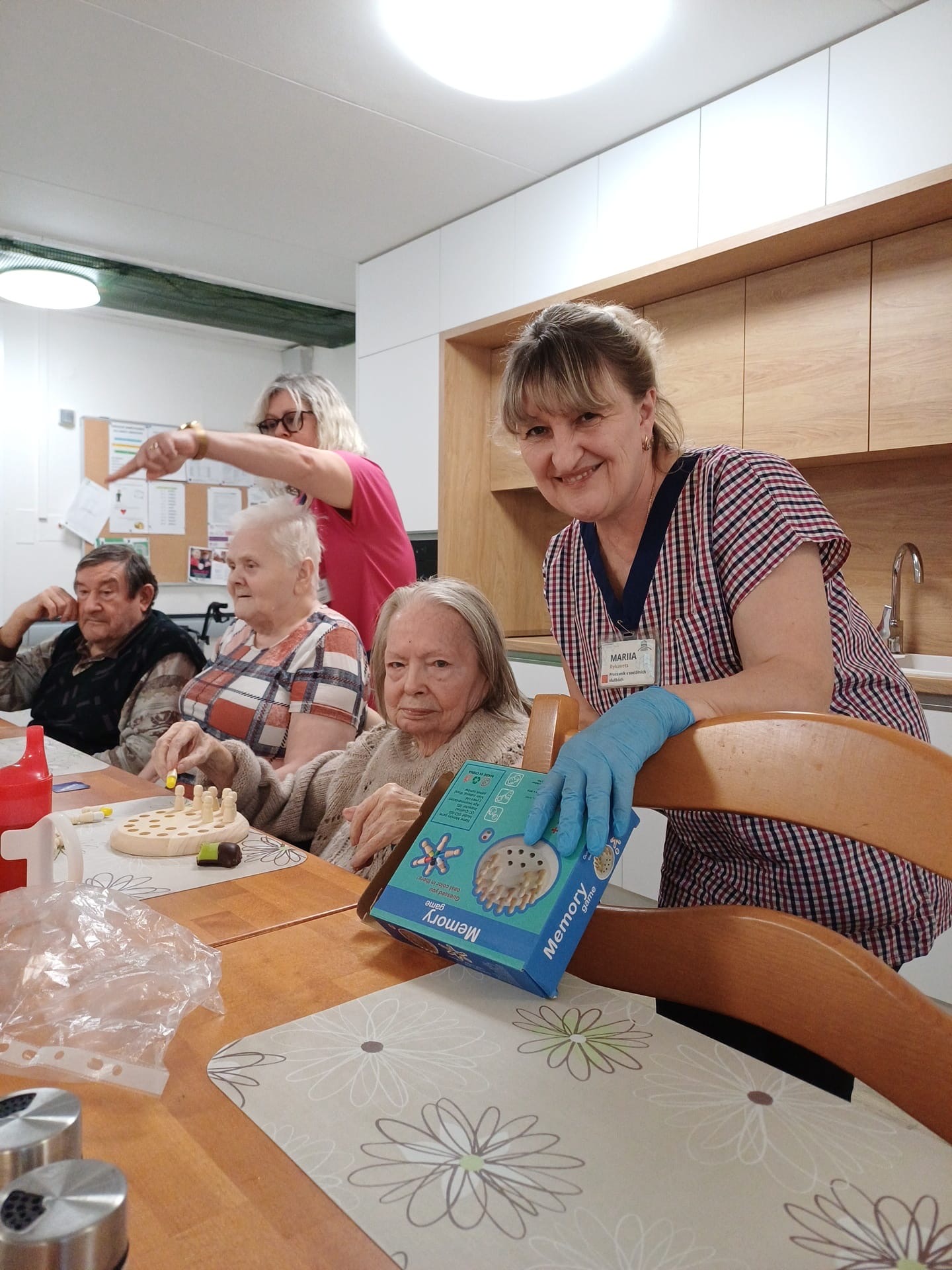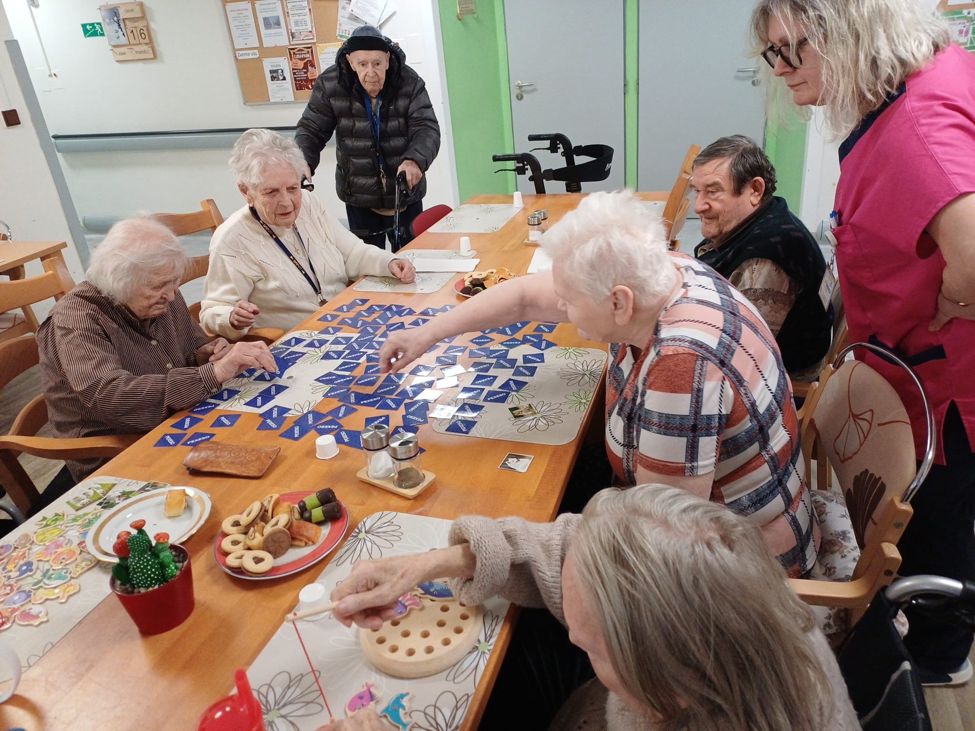 Na patře B1 proběhlo příjemné herní odpoledne. Klienti Jiří, Lydia, Vlasta, Hana, Zdeňka a Marie si společně s pečovatelkami Doubravkou, Marií a Ivou zahráli pexeso, chytali rybičky a vyzkoušeli řadu dalších her zaměřených na procvičení paměti, jemné motoriky a soustředění. Aktivita probíhala v uvolněné a přátelské atmosféře, klienti se zapojovali s chutí a radostí. Pro zpříjemnění odpoledne si společně poseděli u kávy či čaje a pochutnali si na drobných sladkostech, což přispělo k velmi hezkému a klidnému průběhu setkání.
