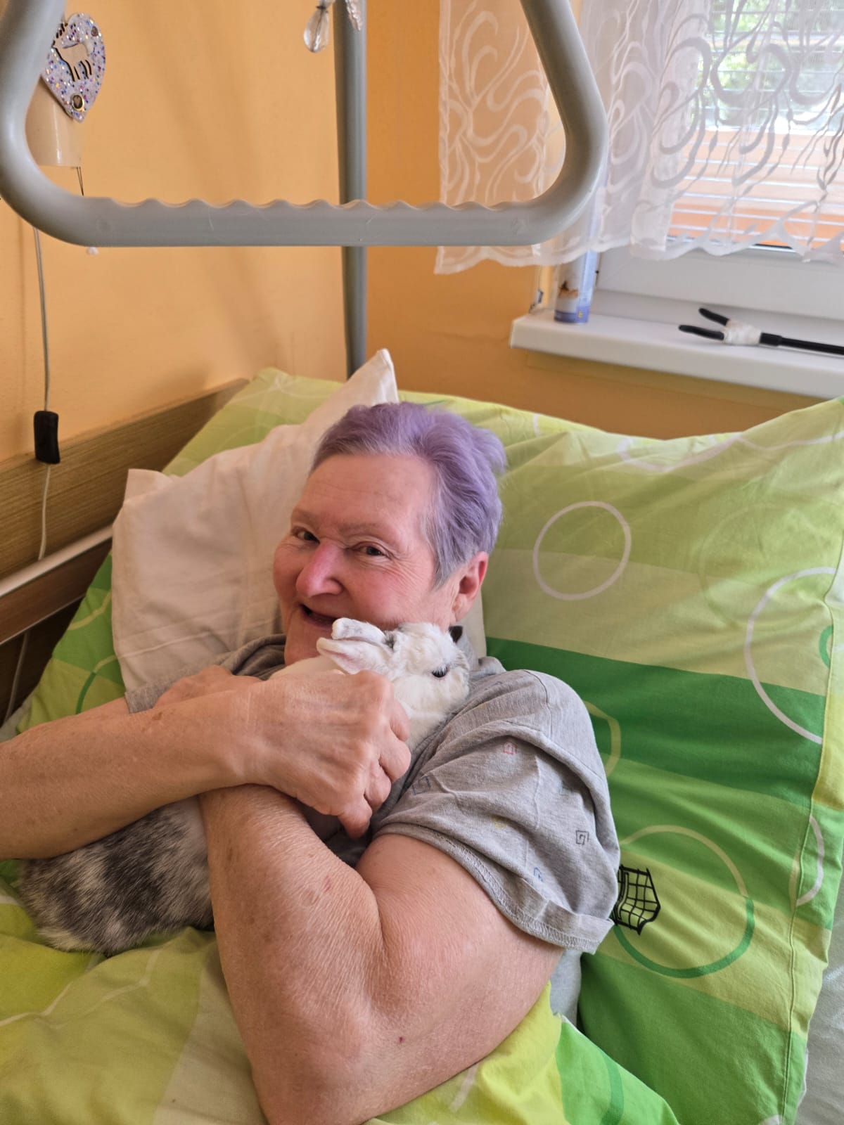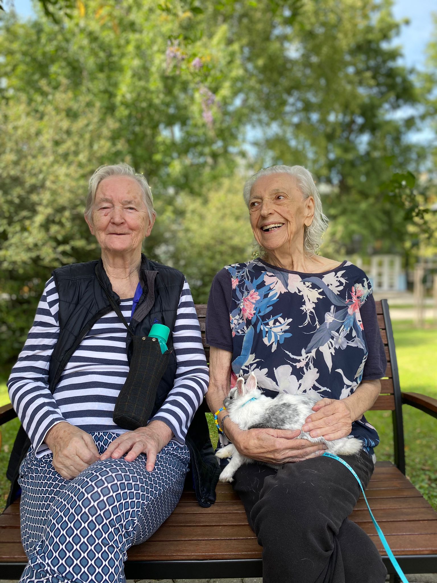 Velikou radost dělají obyvatelům domova B návštěvy králíka Belly. Paní Almě a Heleně dělala Bella milou společnost i při posezení v zahradě Domova.