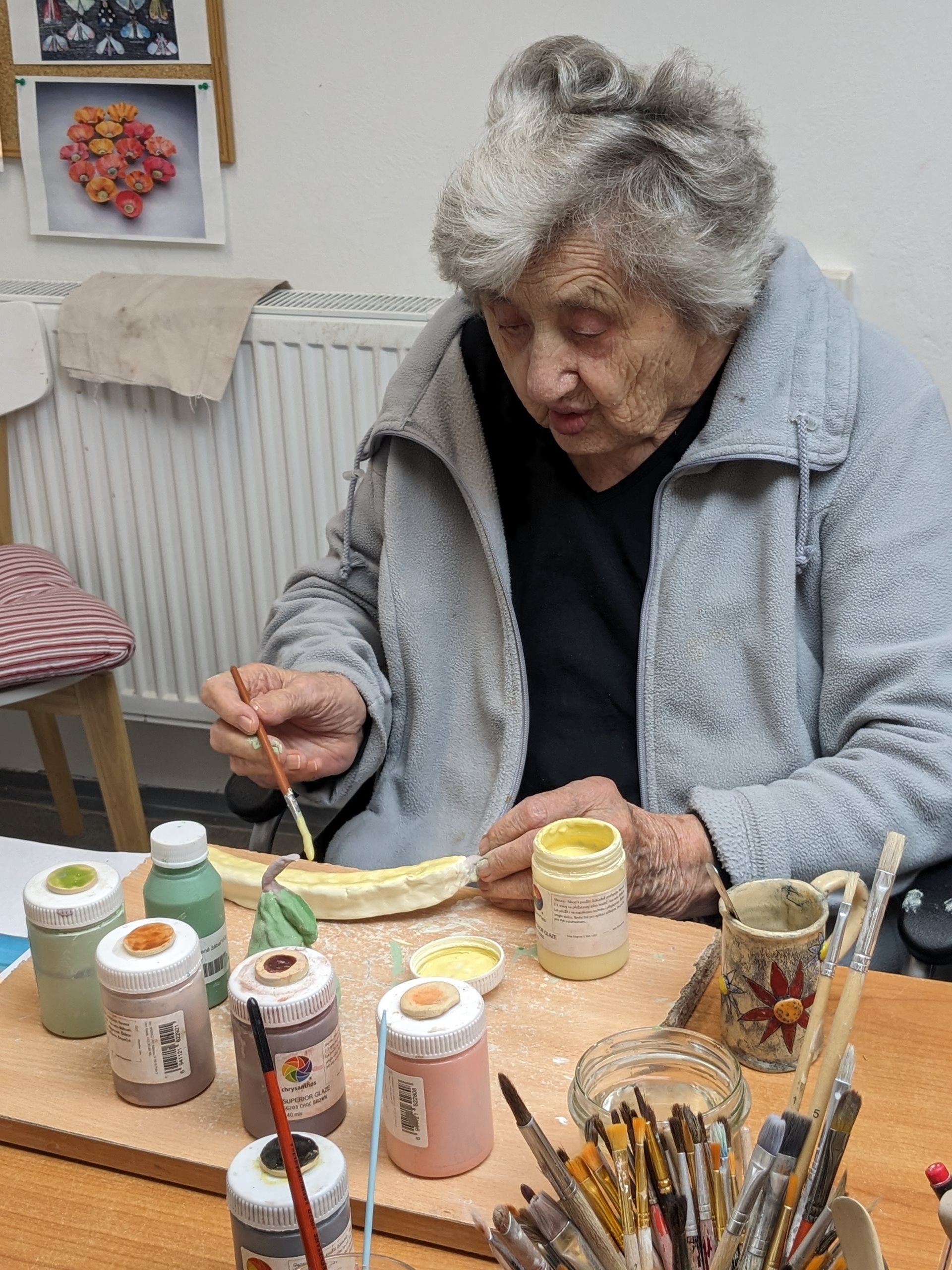 Tvoření v keramické dílně si společně užívaly paní Jiřina, Zlata, Alma, Helena a Věra.