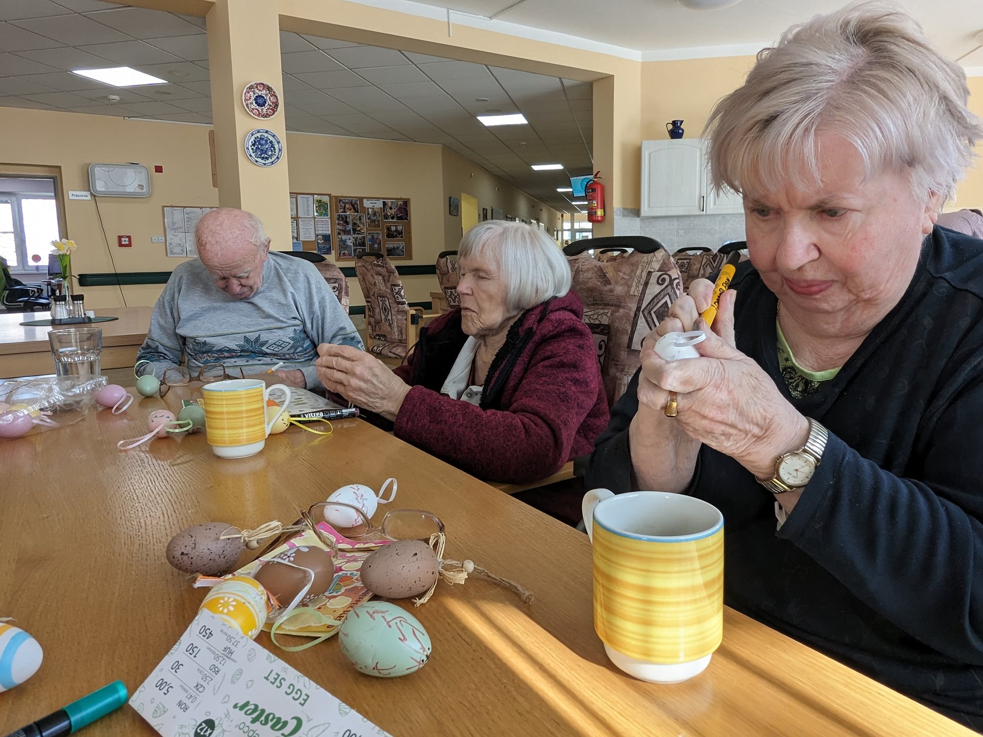 Další milou návštěvou byla Miss sympatie Natálie Kovářová, která se v rámci svého projektu Daruj čas pustila s klienty do barvení vajíček a setí osení.