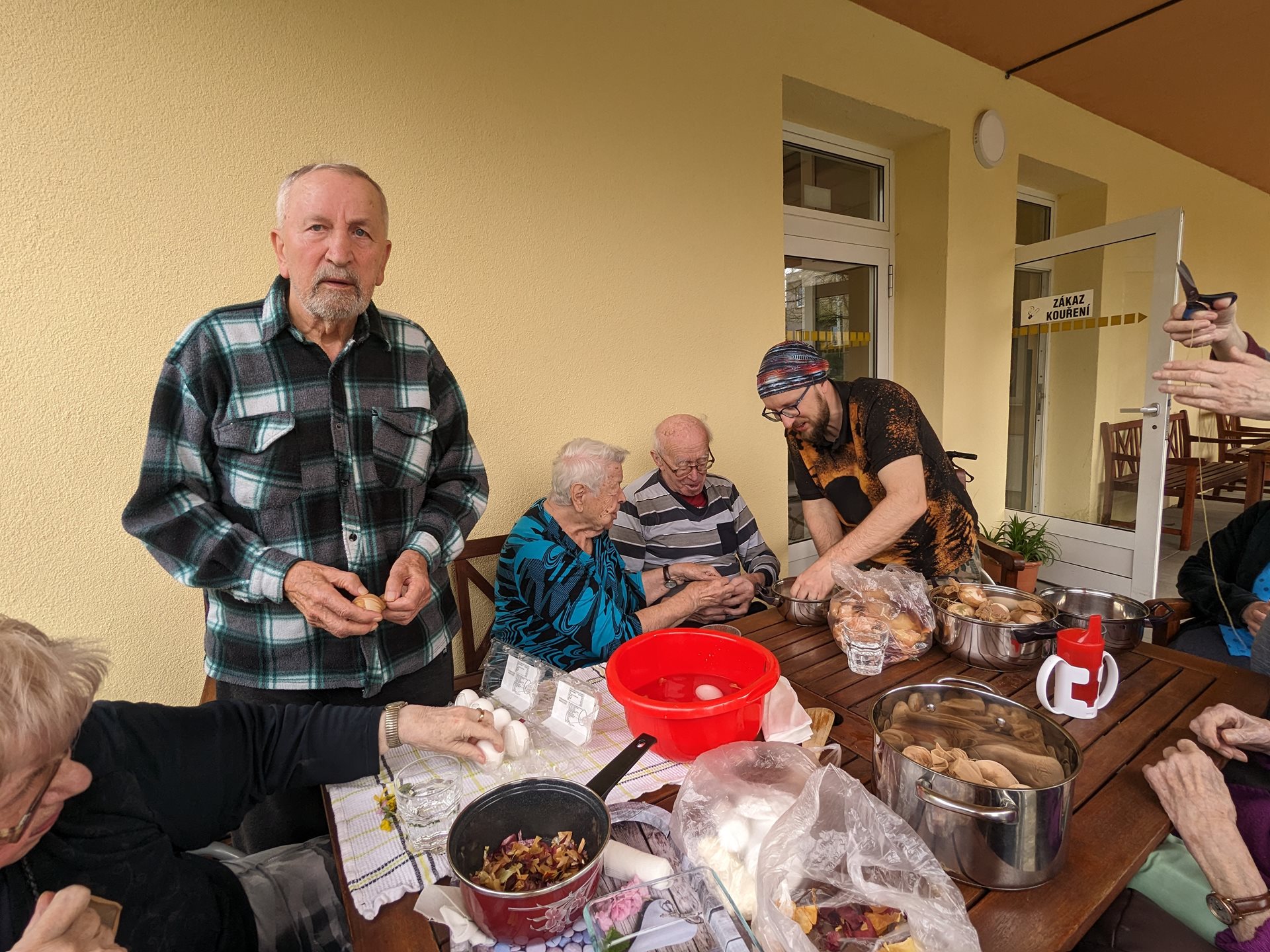 Přírodnímu barvení vajec se věnovali klienti s aktivizačními pracovníky Šárkou a Robertem, se kterými vajíčka ozdobili květy a listy, a poté vařili ve vodě s cibulovými listy.