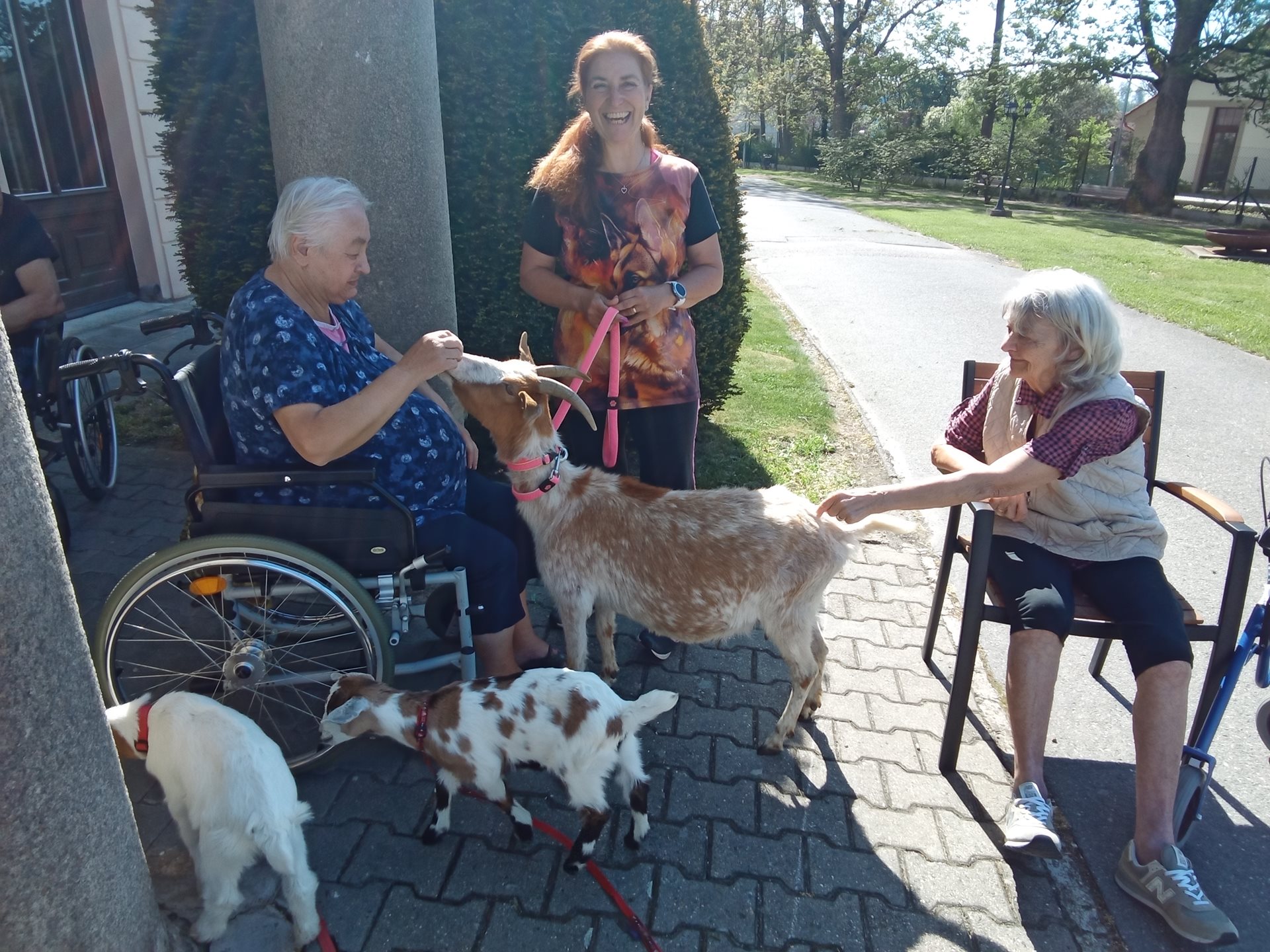 Animoterapie se díky příjemnému počasí mohou uskutečnit i v zámeckém parku, kde klienti mohou přivítat i taková zvířata jako jsou koza nebo mini koník.