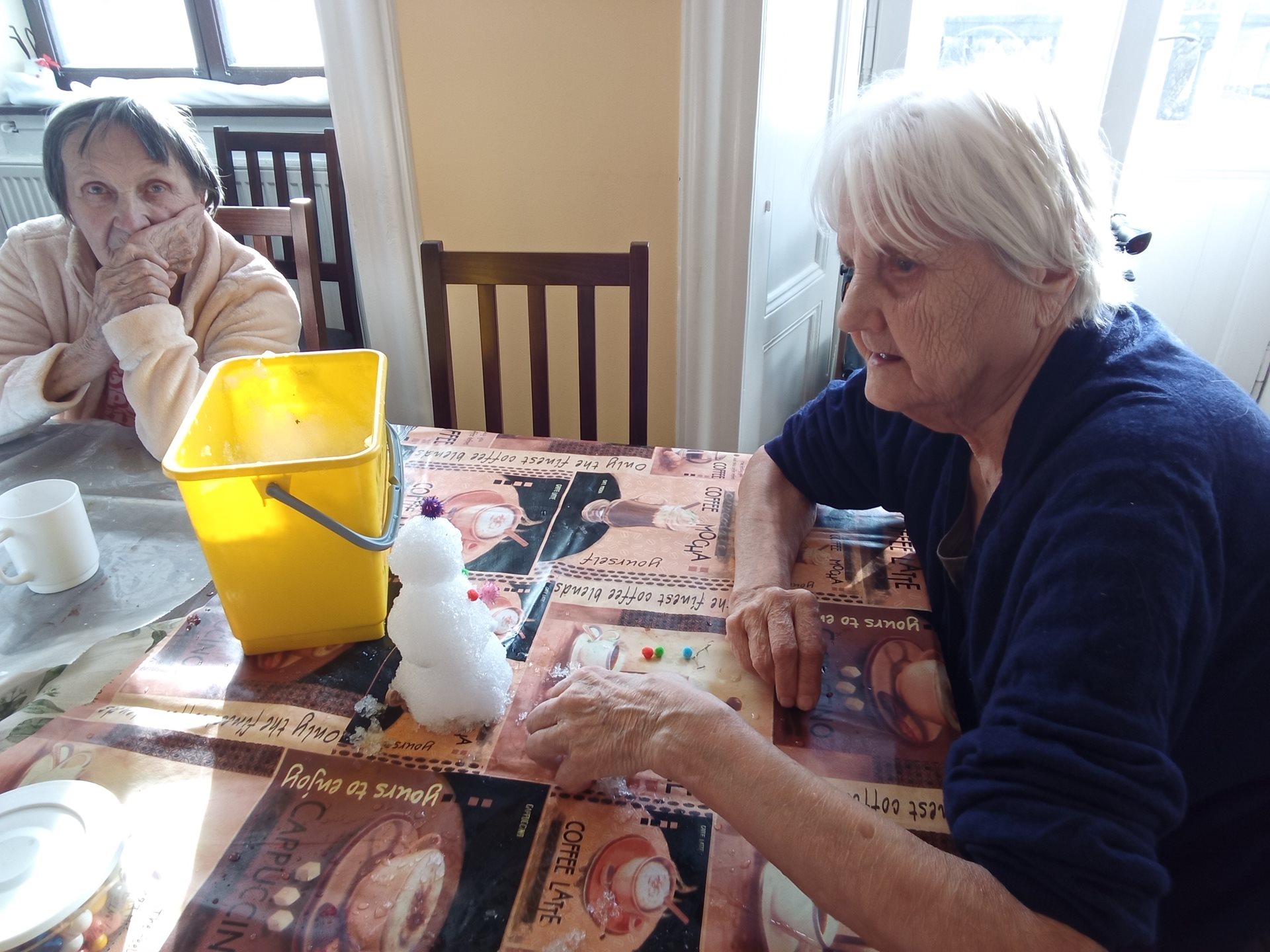 Aktivizační pracovnice Bára využila sněhové nadílky v zámeckém parku a potěšila paní Evu, Jaroslavu, Zdeňku a Elišku společným stavěním sněhuláků na stole v teple domova.