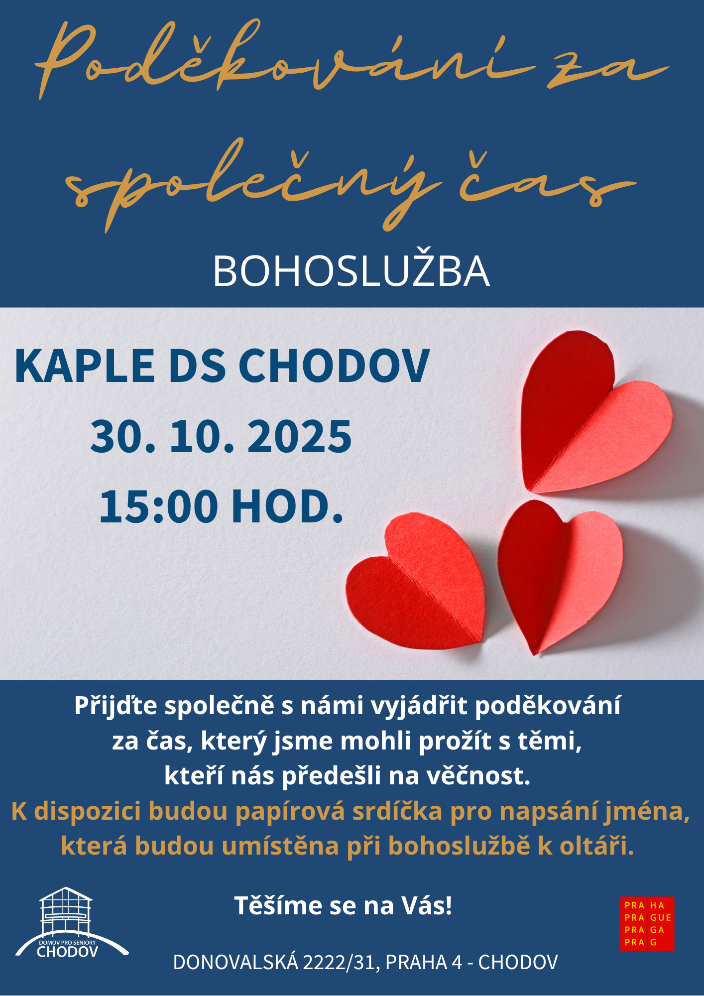 „Poděkování za společný čas“, která se bude konat ve čtvrtek 30. 10. 2025 od 15 hod. v kapli DS Chodov.
